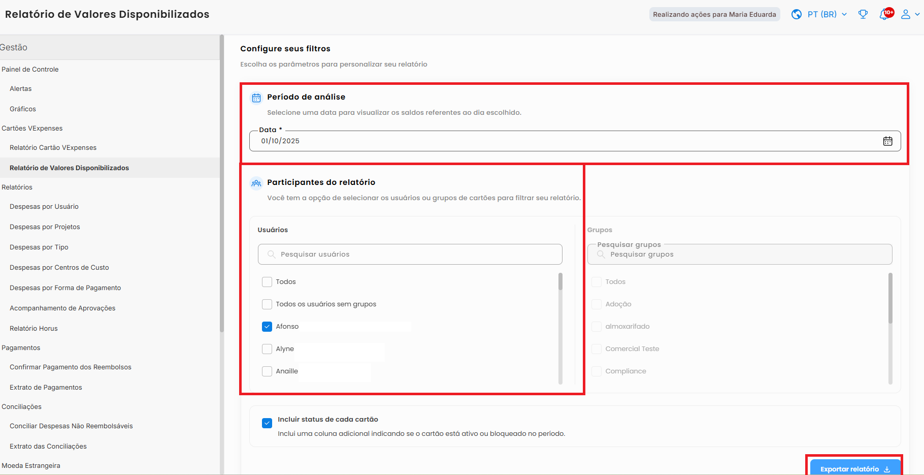 Se desejar, selecione a opção de incluir o status do cartão de ativo ou bloqueado no relatório.