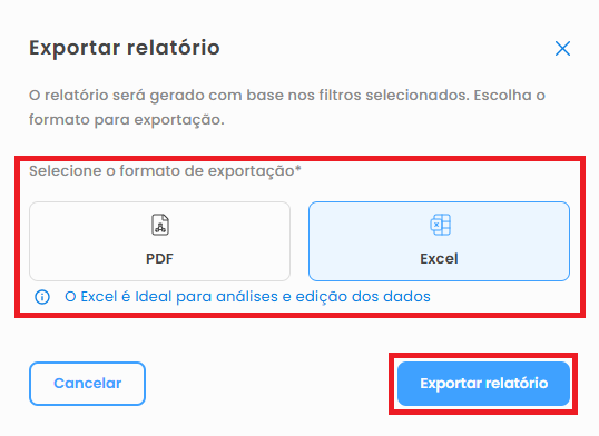3. Selecione o formato desejado (PDF ou Excel) e clique em "Exportar relatório".