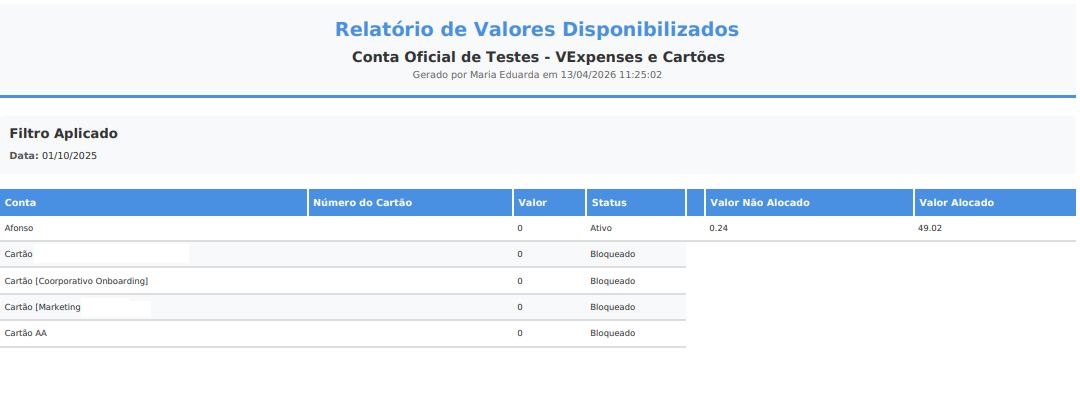4. O relatório apresenta os valores de cada cartão na data filtrada, com nome e os 4 últimos dígitos do cartão, e valores totais alocados e não alocados da empresa.