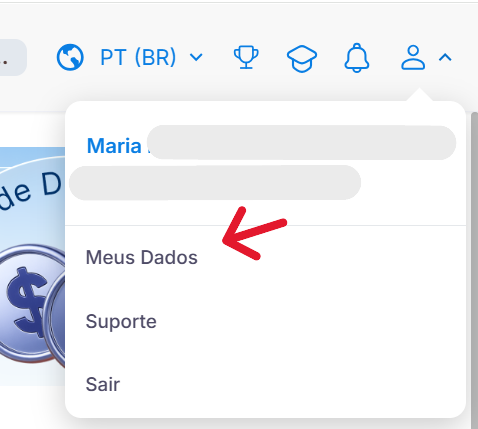 1) No site, clique no ícone do boneco e selecione a opção "Meus Dados".