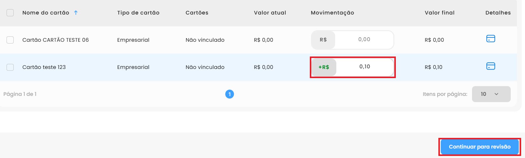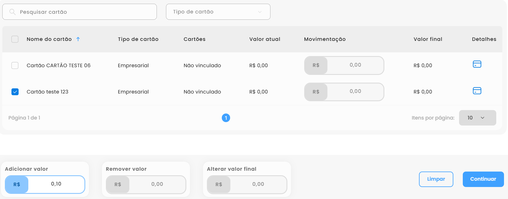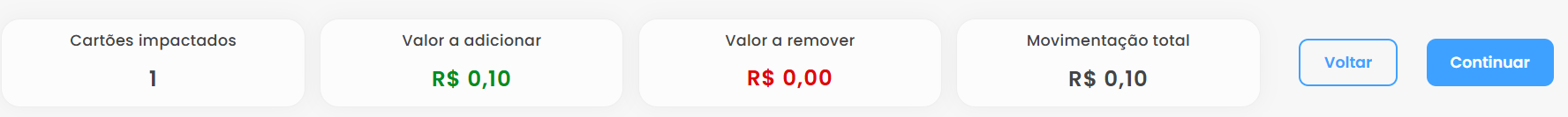 5. Selecione os cartões, defina o valor e o que deseja fazer: adicionar, remover ou alterar o valor final.