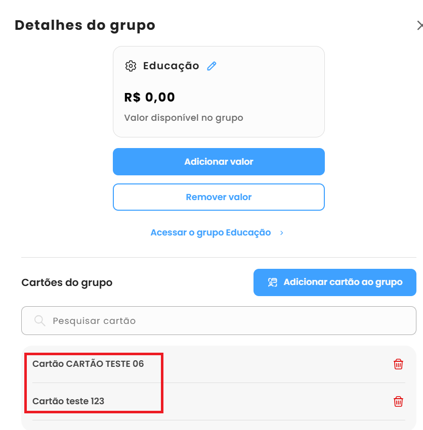 1. Para remover um cartão do grupo, clique no grupo e na parte "Cartões do grupo", selecione o ícone de lixeira na linha do cartão que deseja remover.