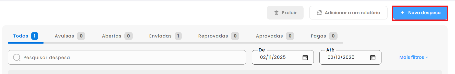 Ou, se preferir, o usuário pode ir diretamente no menu "Despesas" do site e clicar em "Adicionar" para criar uma nova despesa e vinculá-la no relatório que já foi criado anteriormente.