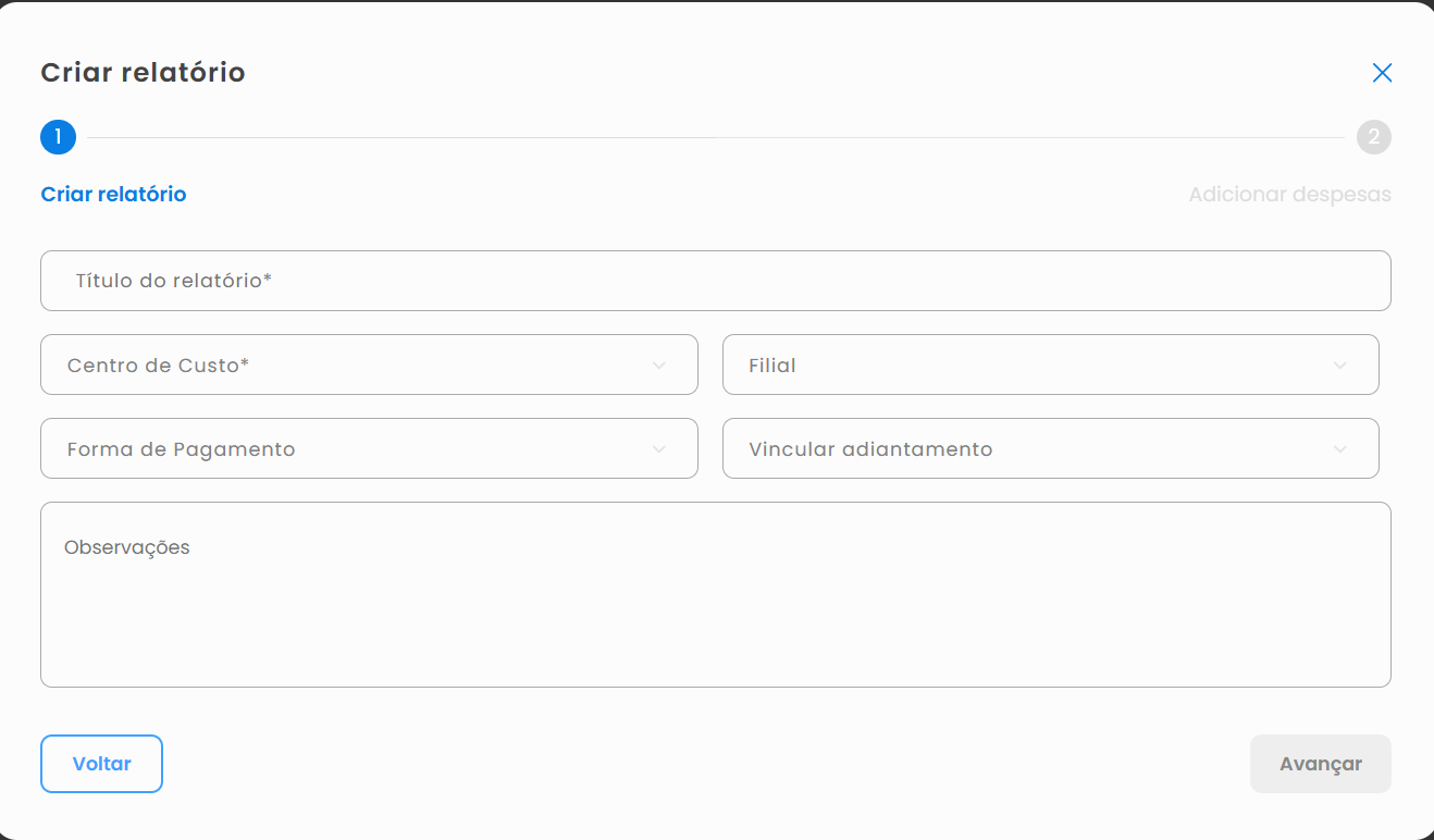3. Para criar seu relatório, é obrigatório preencher um título e escolher um centro de custo entre as opções disponibilizadas pela sua empresa.