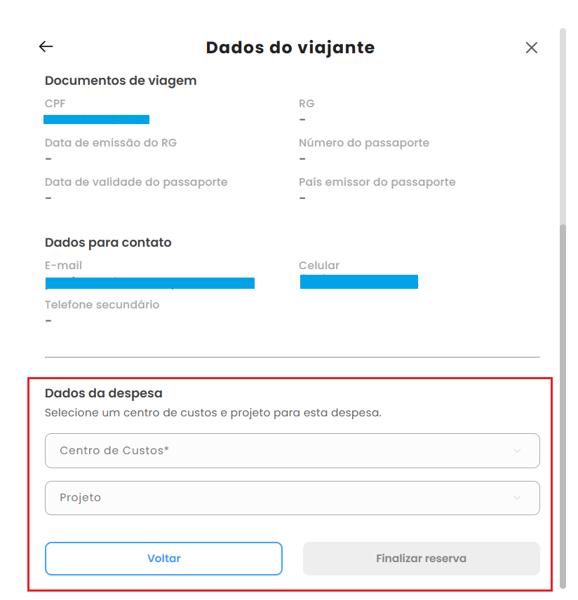 5️⃣ Verifique os dados do viajante e defina o centro de custo e projeto