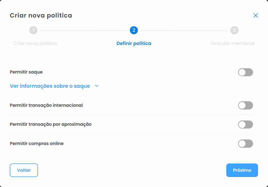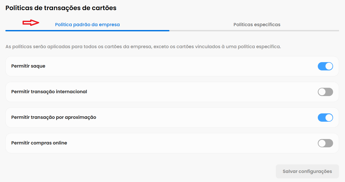2️⃣ Selecione a opção "Política padrão da empresa". Para permitir saque, transação internacional, aproximação ou compras online, basta ativar a configuração clicando ao lado da regra desejada.