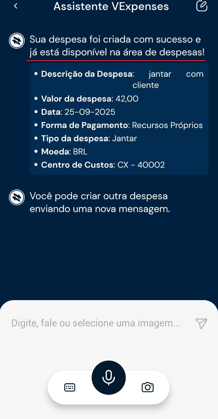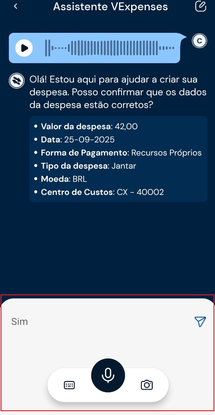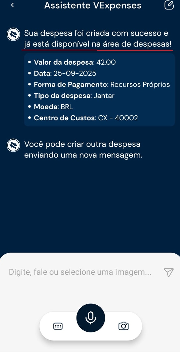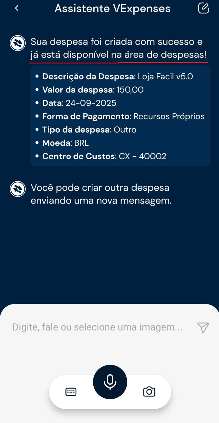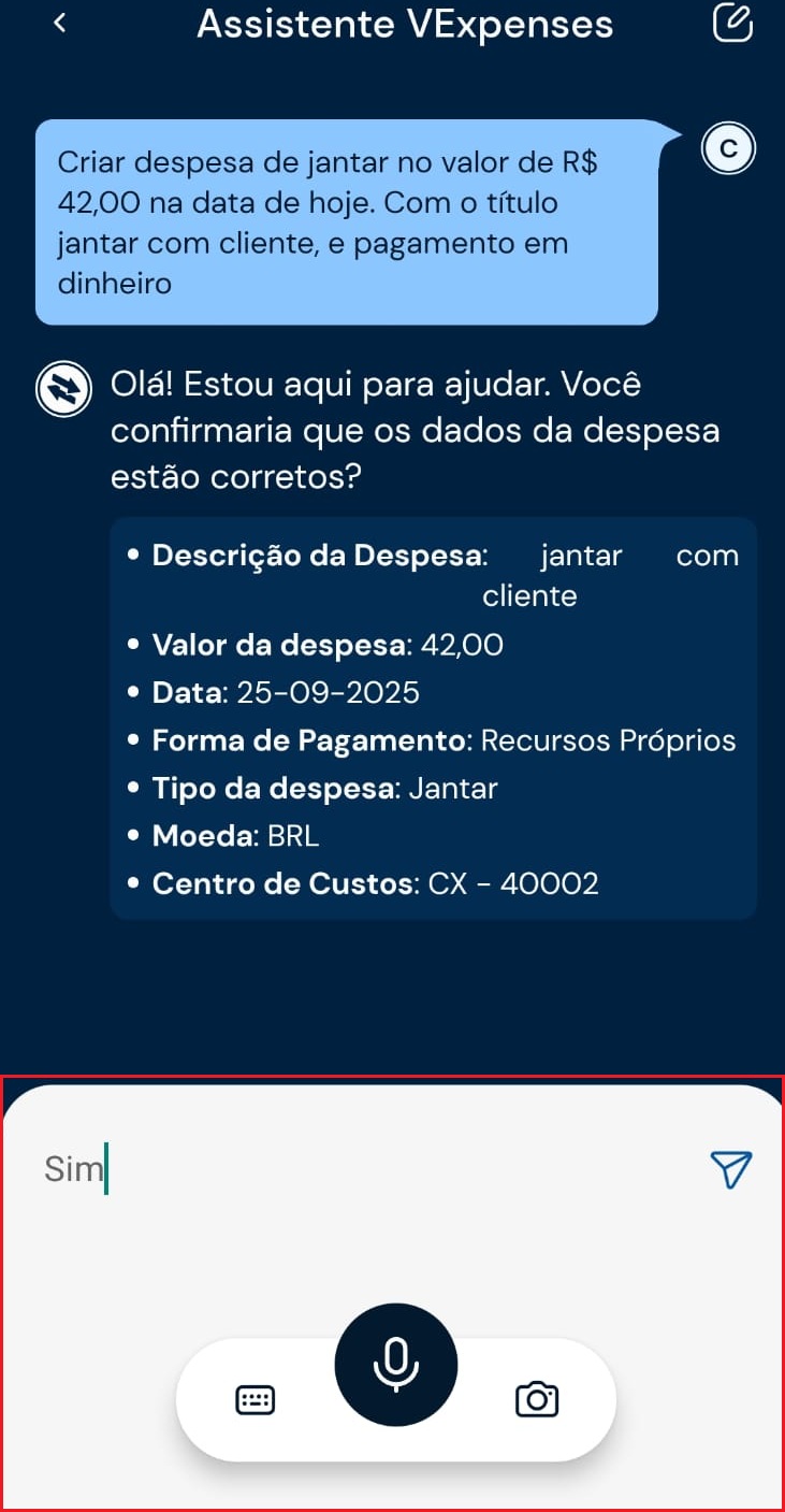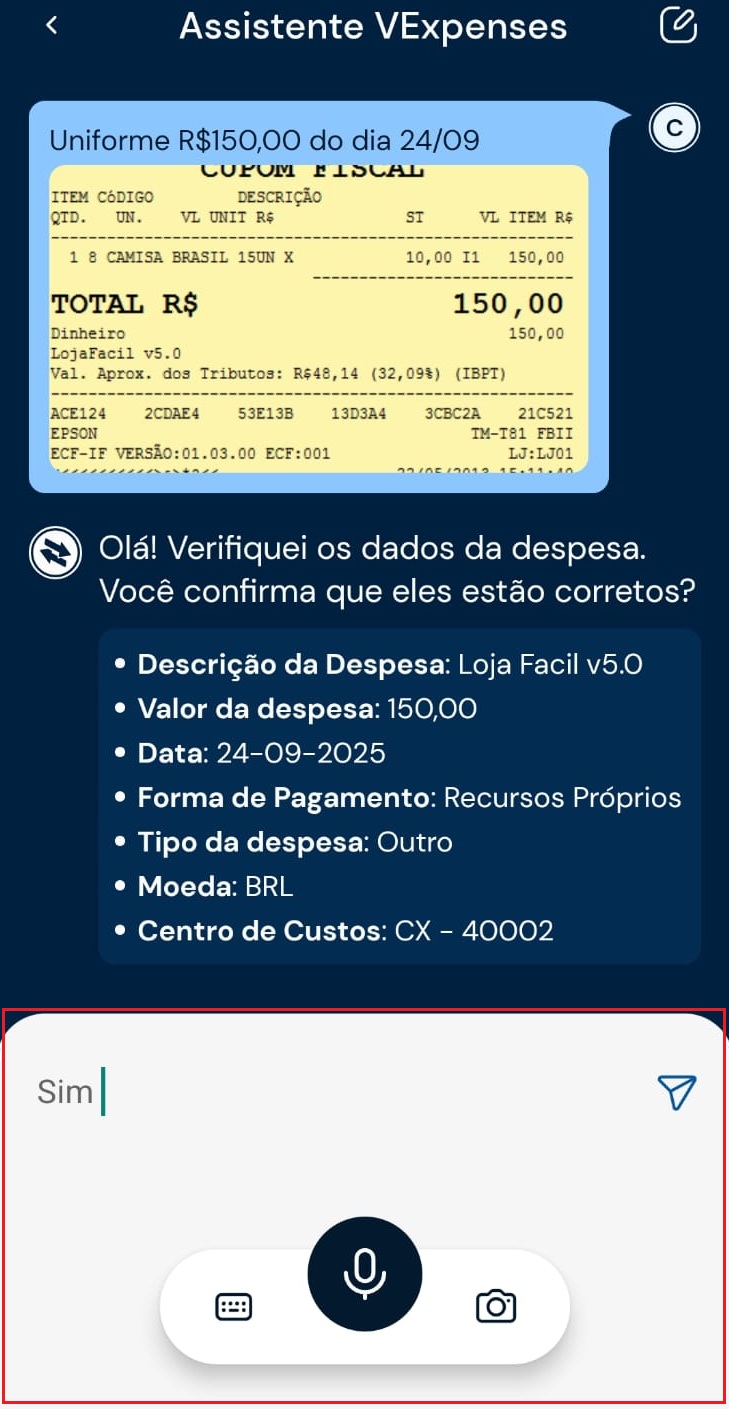 3) O assistente preencherá os dados informados. Revise os dados no chat e confirme para incluir a despesa.