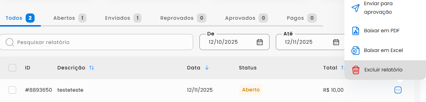 Para excluir um relatório com status "aberto", siga o passo a passo a seguir: