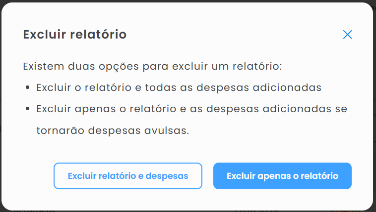 3. O sistema irá pergunta se deseja apagar o relatório juntamente com as despesas contidas nele ou apagar somente o relatório (nessa opção, as despesas voltarão como "avulsas" na plataforma);