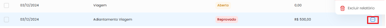 2. Clique no ícone com três pontos na mesma linha do relatório para expandir as opções, e selecione "Excluir Relatório";