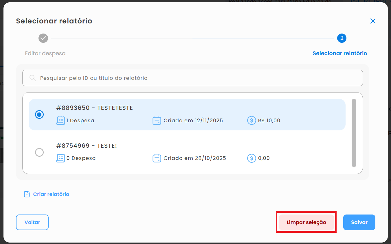 Não é possível apagar um relatório que contenha despesas feitas no cartão VExpenses.