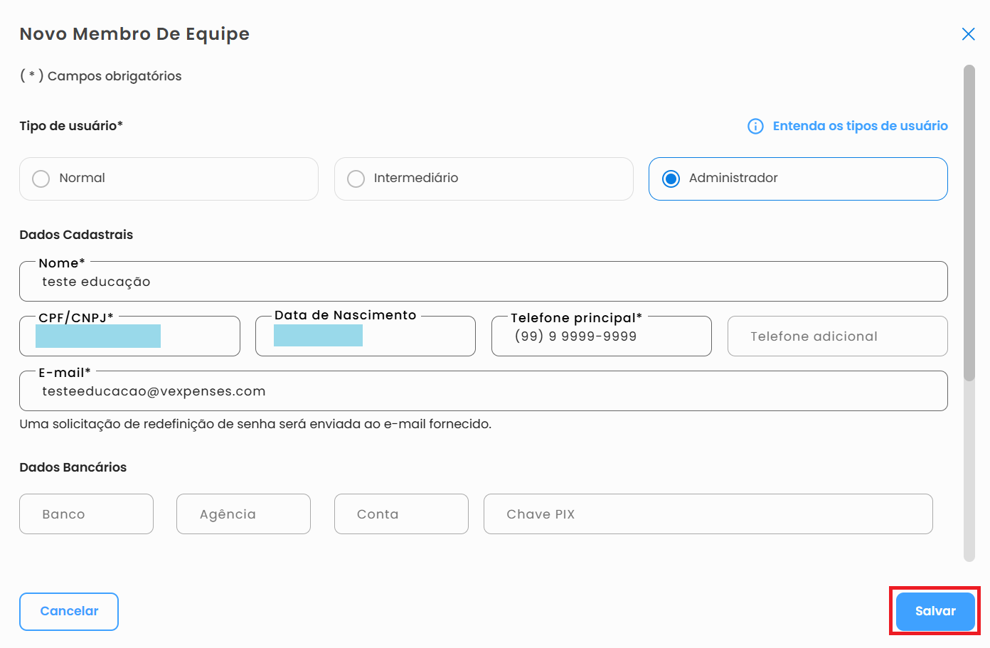 Para maior segurança dos seus dados, implementamos a Chave de Segurança no cadastro de um novo usuário com perfil "administrador". Um mecanismo adicional para proteger ações sensíveis dentro da plataforma.