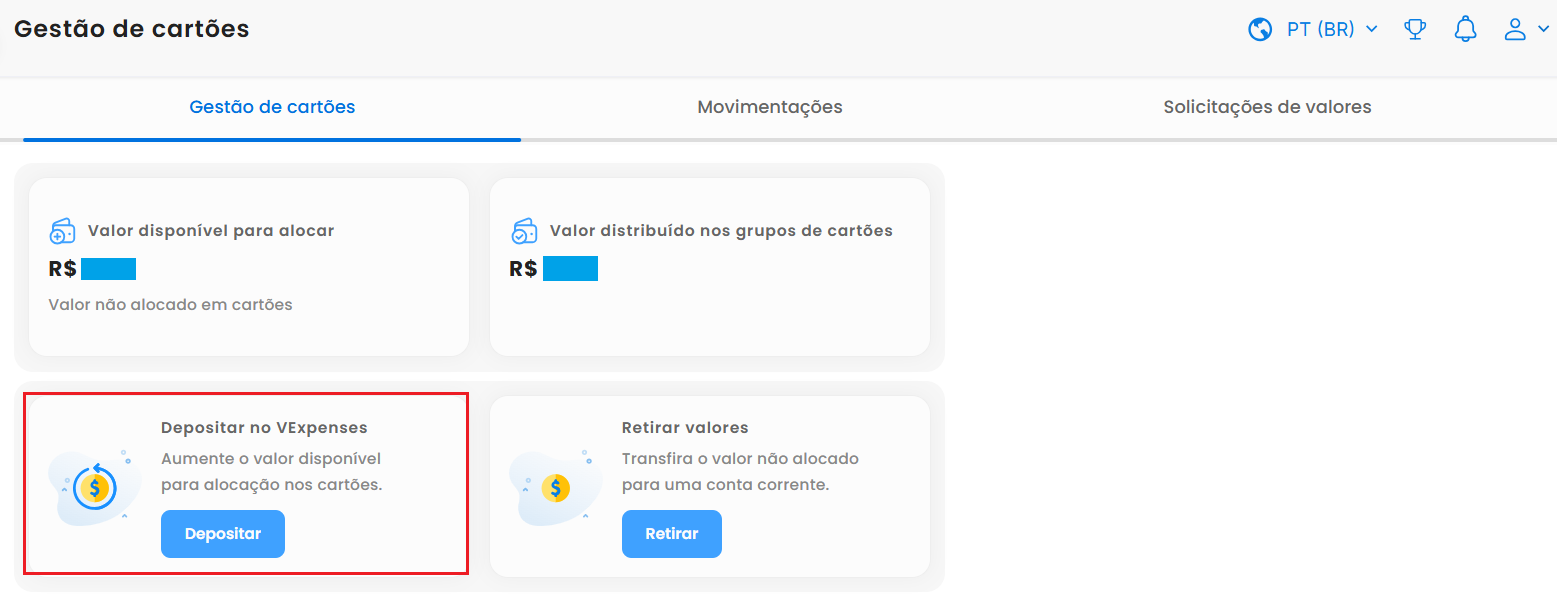 2. Após, clique em "Depositar" no campo "Depositar no VExpenses".