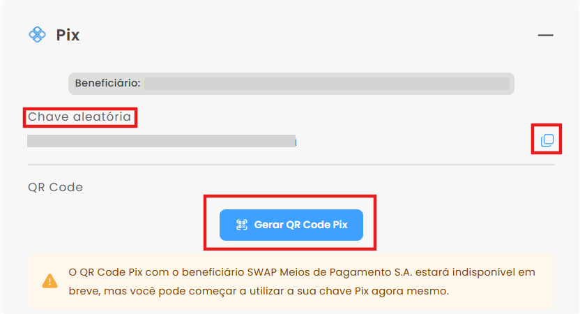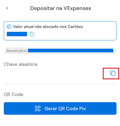 2. Toque no ícone de copiar ao lado da chave aleatória ou selecione "Gerar QR Code Pix".
