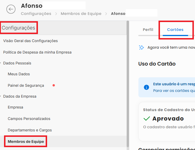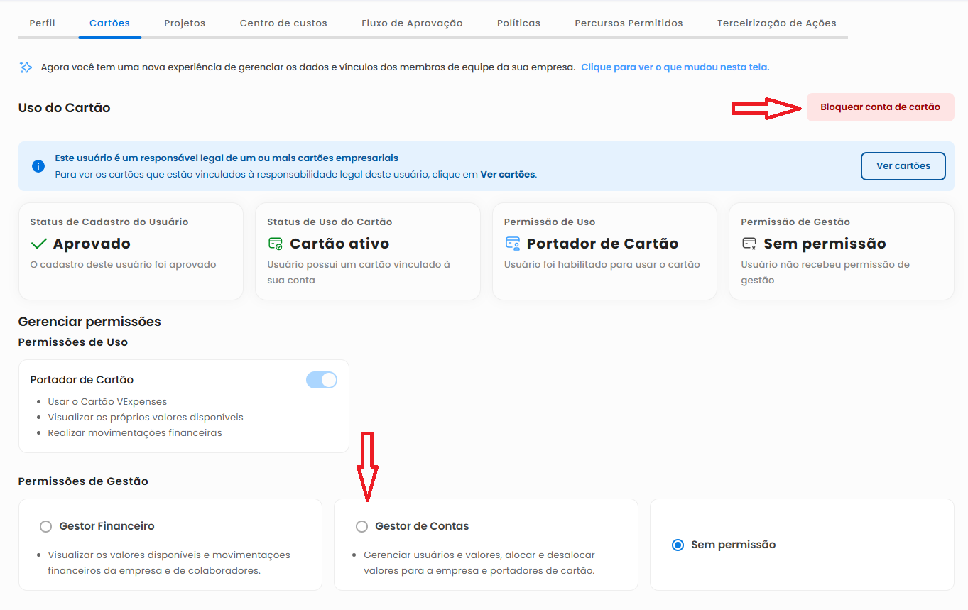 Se você é um Gestor de contas e deseja bloquear a conta de conta de cartão ou promover um usuário a Gestor de contas, siga o passo a passo a seguir: