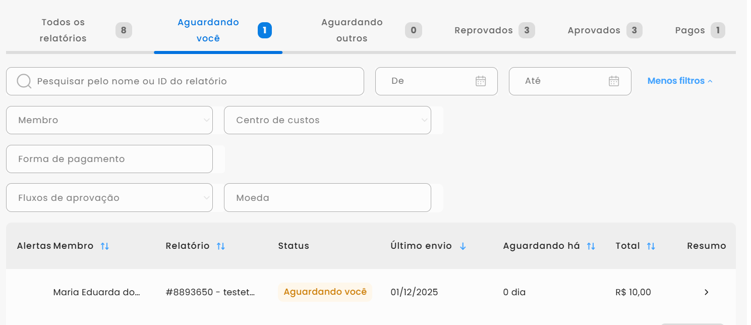 Além disso, o aprovador também pode escolher entre um um usuário específico para ver os relatórios, ou um fluxo de aprovação em que ele é aprovador.