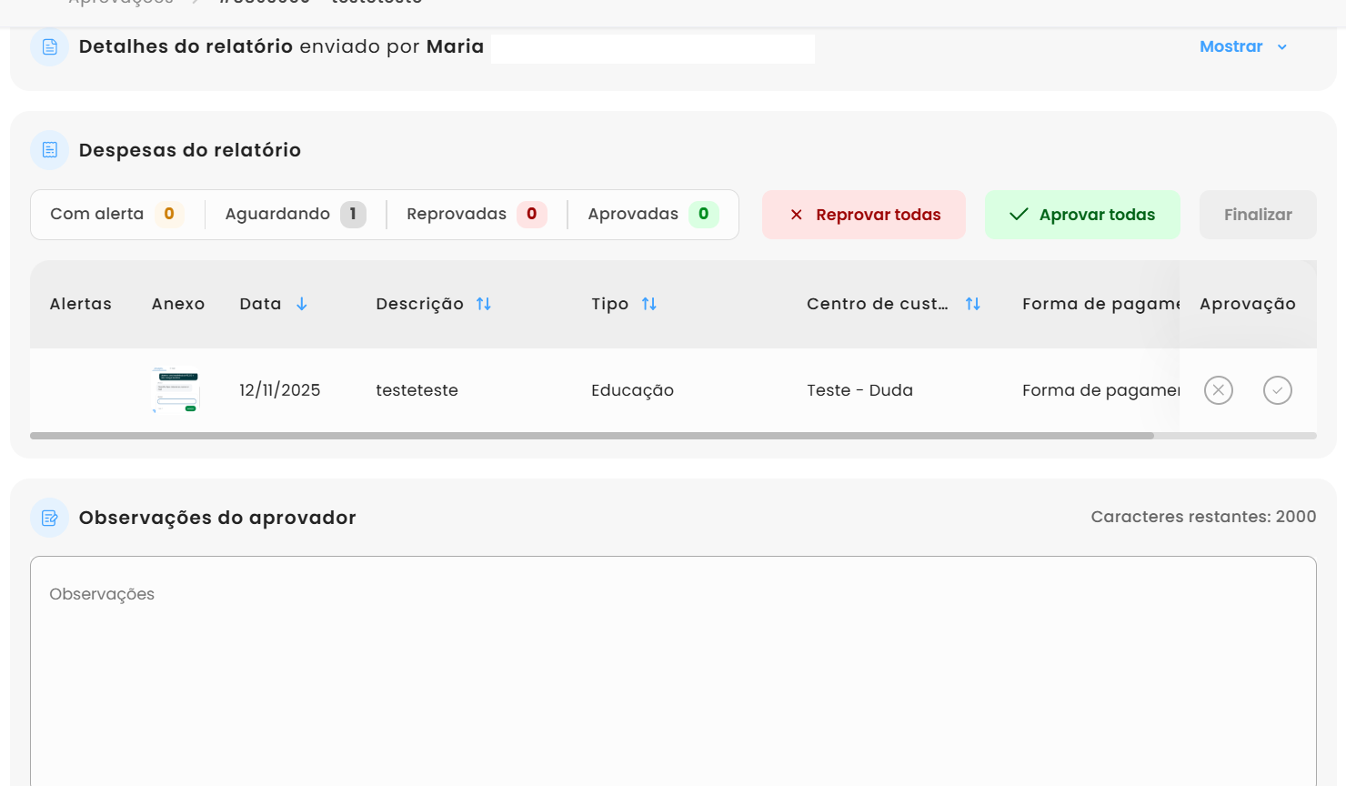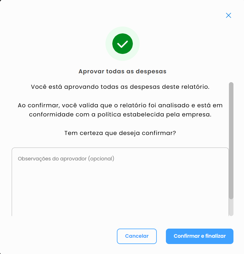 Caso queira aprovar ou reprovar todas as despesas de uma vez, selecione “Aprovar todos” ou “Reprovar todos” para aplicar a ação a todas as despesas dentro do relatório.
