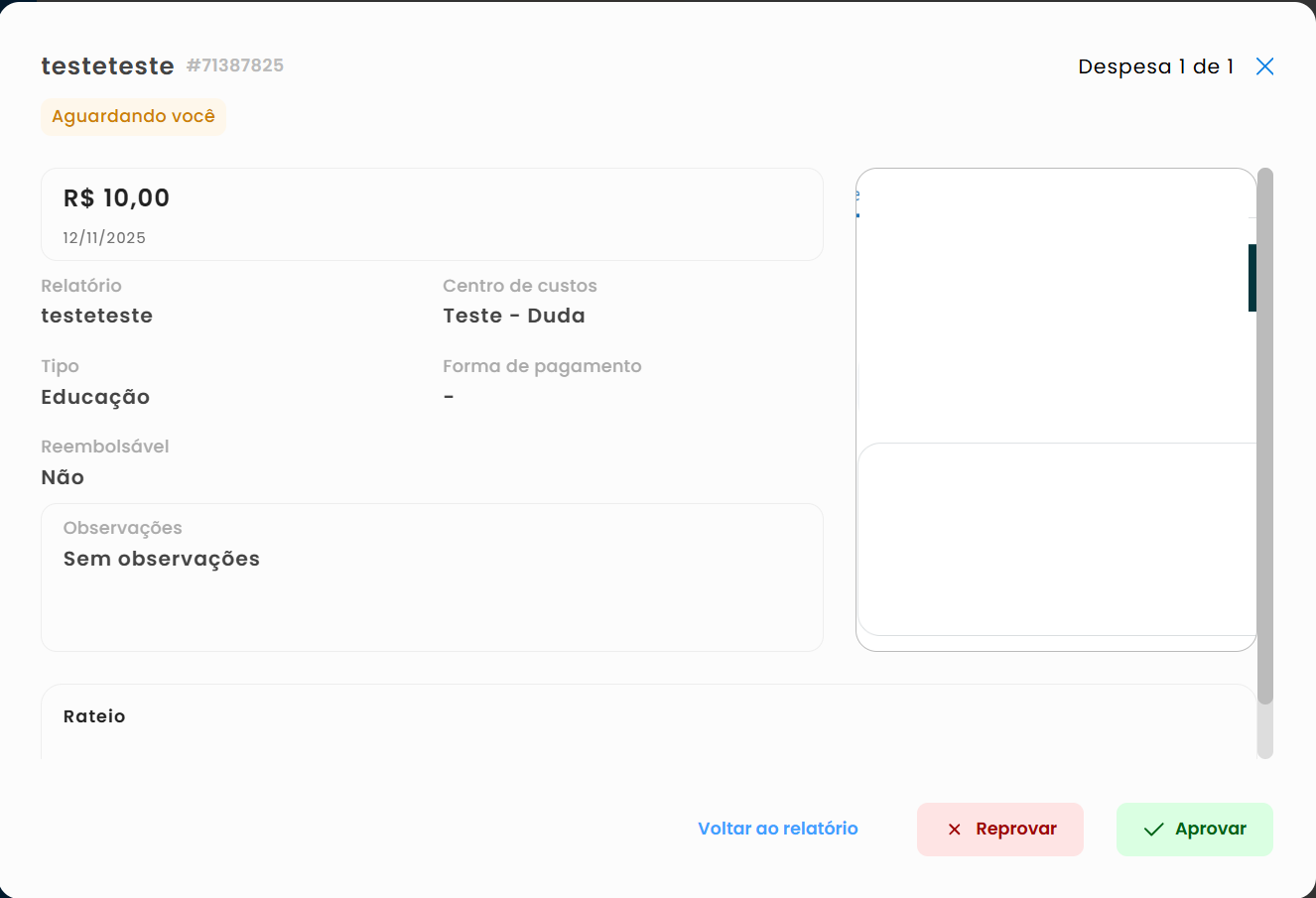 disponível apenas para despesas individuais. Não é possível aprovar ou reprovar relatórios
