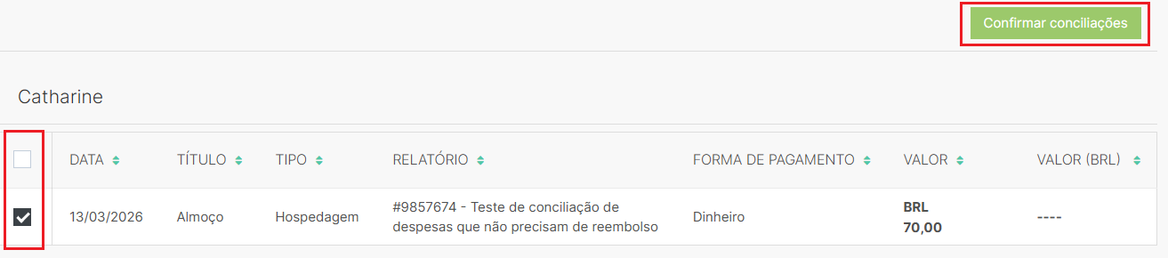 3. Depois de selecionar os filtros, clique em "Filtrar". Em seguida, na caixa de seleção, selecione as despesas que deseja conciliar e clique em "Confirmar Conciliações".