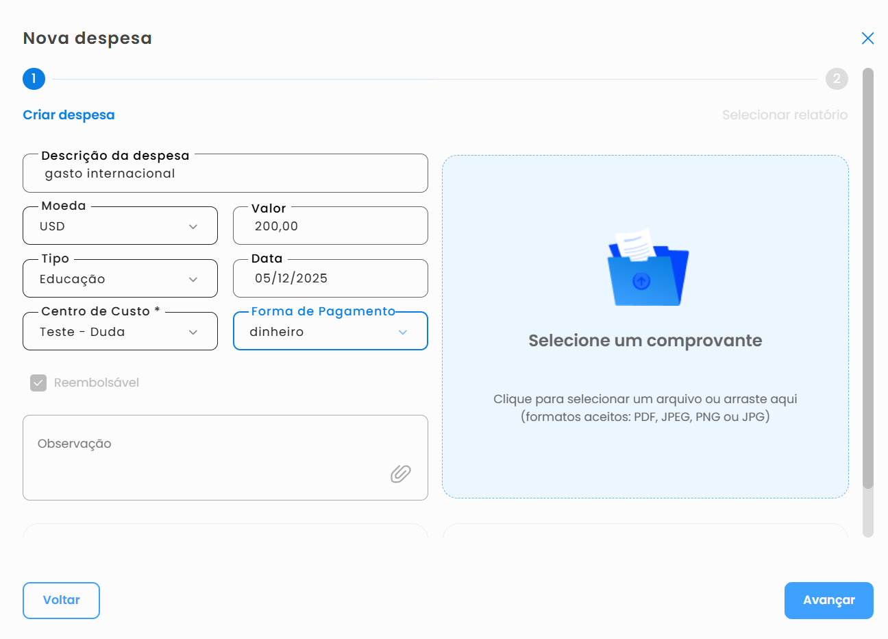 No momento em que os usuários criam suas despesas na plataforma, é possível adicionar a moeda estrangeira em que o gasto foi realizado. Porém, não será possível definir a taxa de câmbio, pois essa definição será feita pelos usuários intermediários ou administradores, após a aprovação dessas despesas.