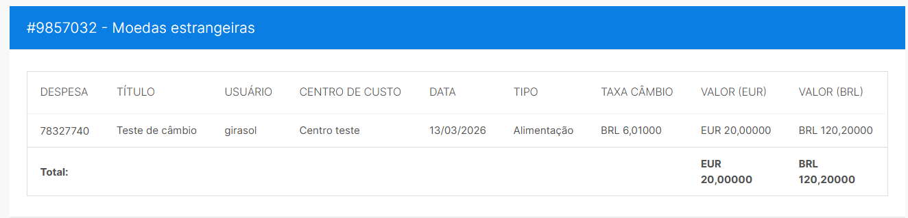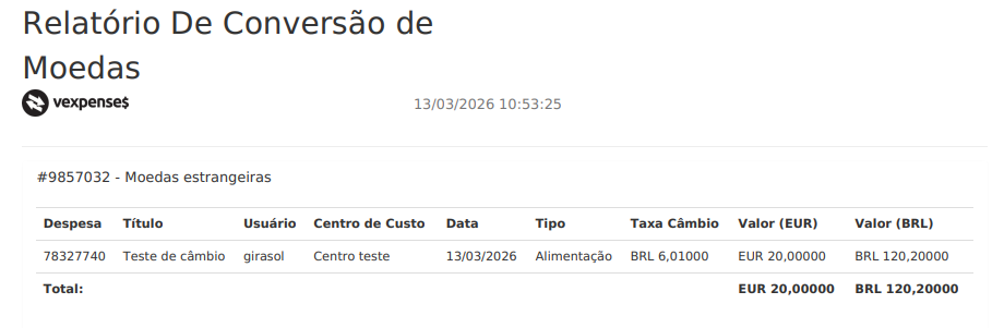 Depois de realizar a conversão de despesas em moedas estrangeiras através da aba de Gestão ou no lançamento das despesas dos usuários, sua empresa pode conferir um extrato com todas conversões realizadas!