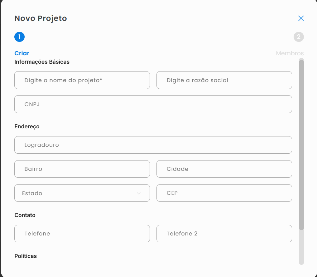3. Um painel com as informações solicitadas para o preenchimento será aberto. No entanto, apenas o campo "Nome" é obrigatório para criação do projeto. Ao finalizar o preenchimento, clique em "Próximo".
