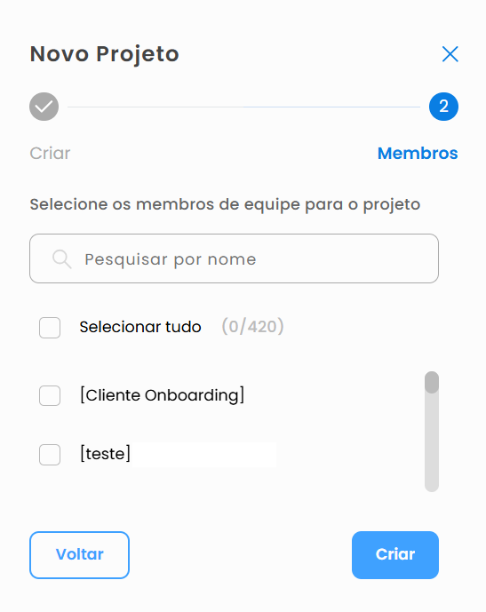 Para isso, selecione o nome dos usuários específicos, ou, se todos os usuários precisam visualizar e lançar despesas nesse projeto, clique em "Selecionar tudo". Ao terminar, clique em "Criar".