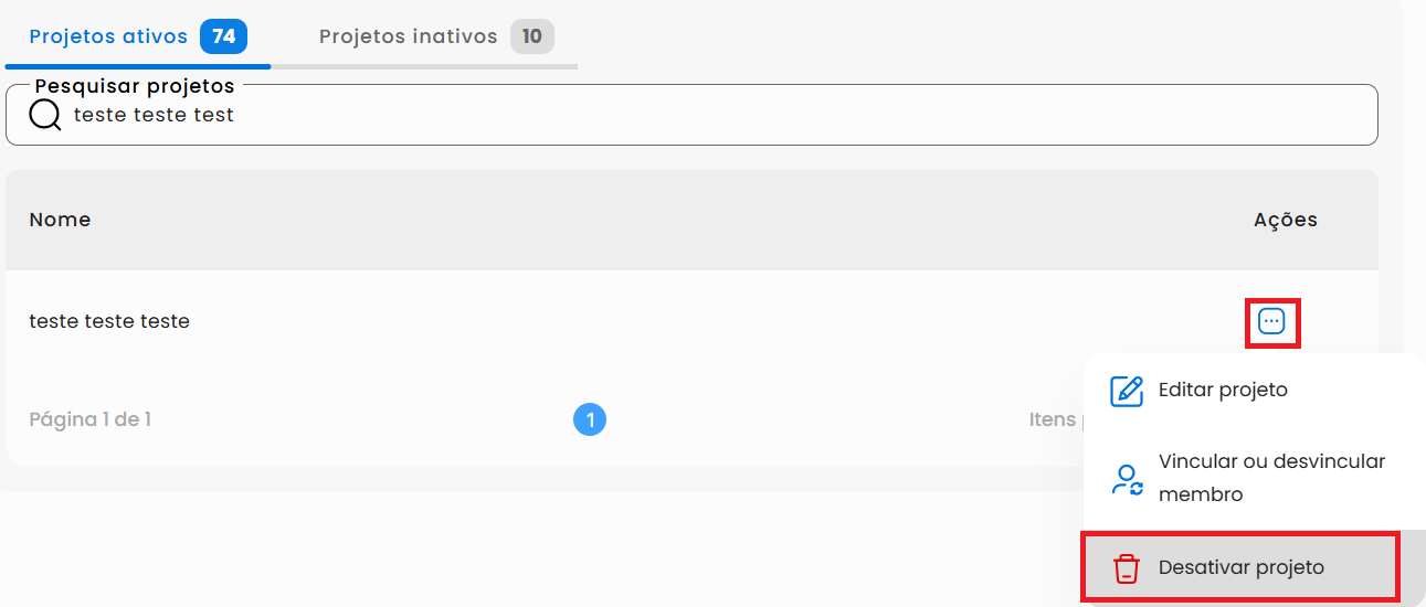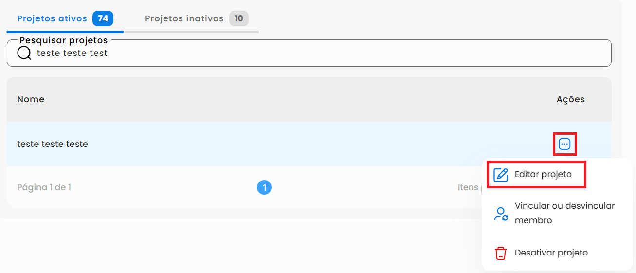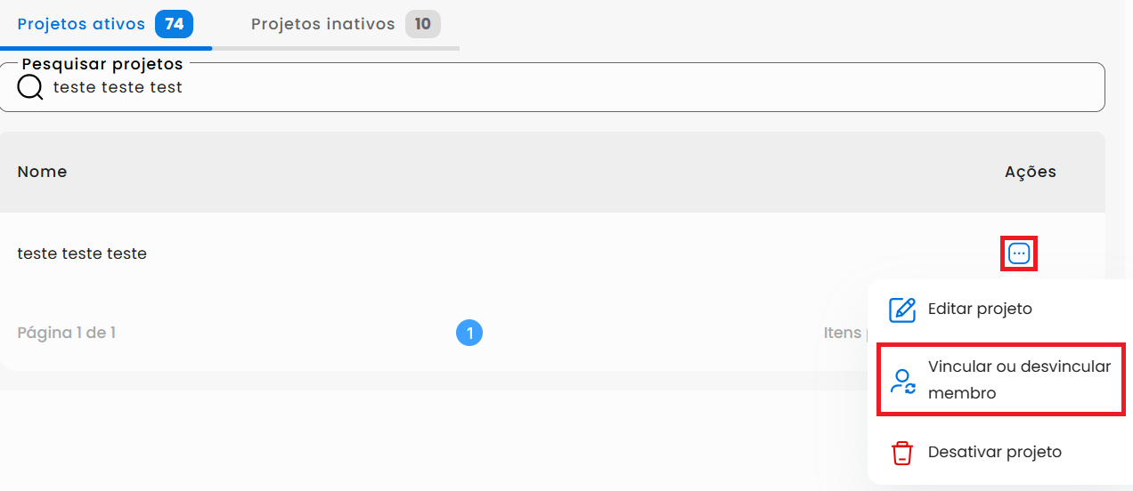 6. Caso queira adicionar ou retirar membros em um projeto, clique em "Ações" > "Vincular ou desvincular membro" e faça as edições.