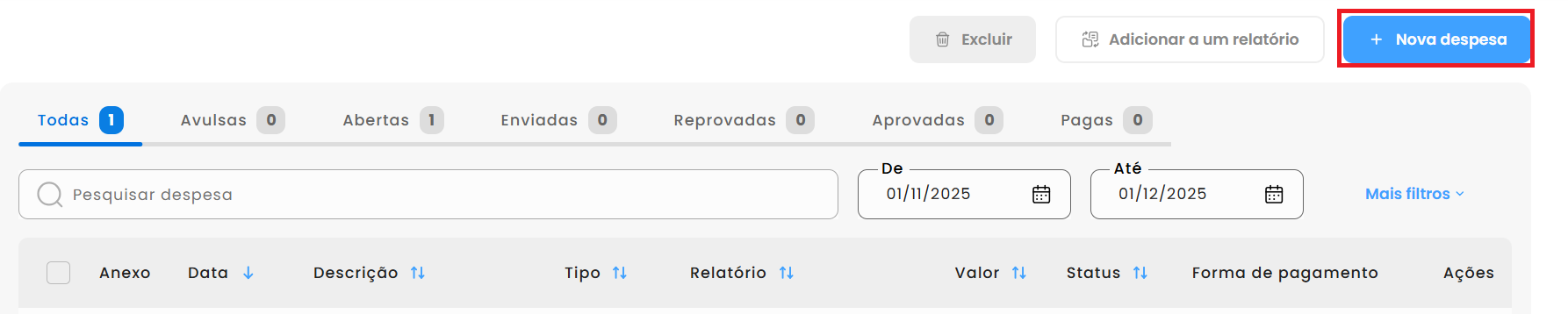 2. Em seguida, o painel de despesas será aberto. Selecione "Adicionar" para criar uma nova despesa.